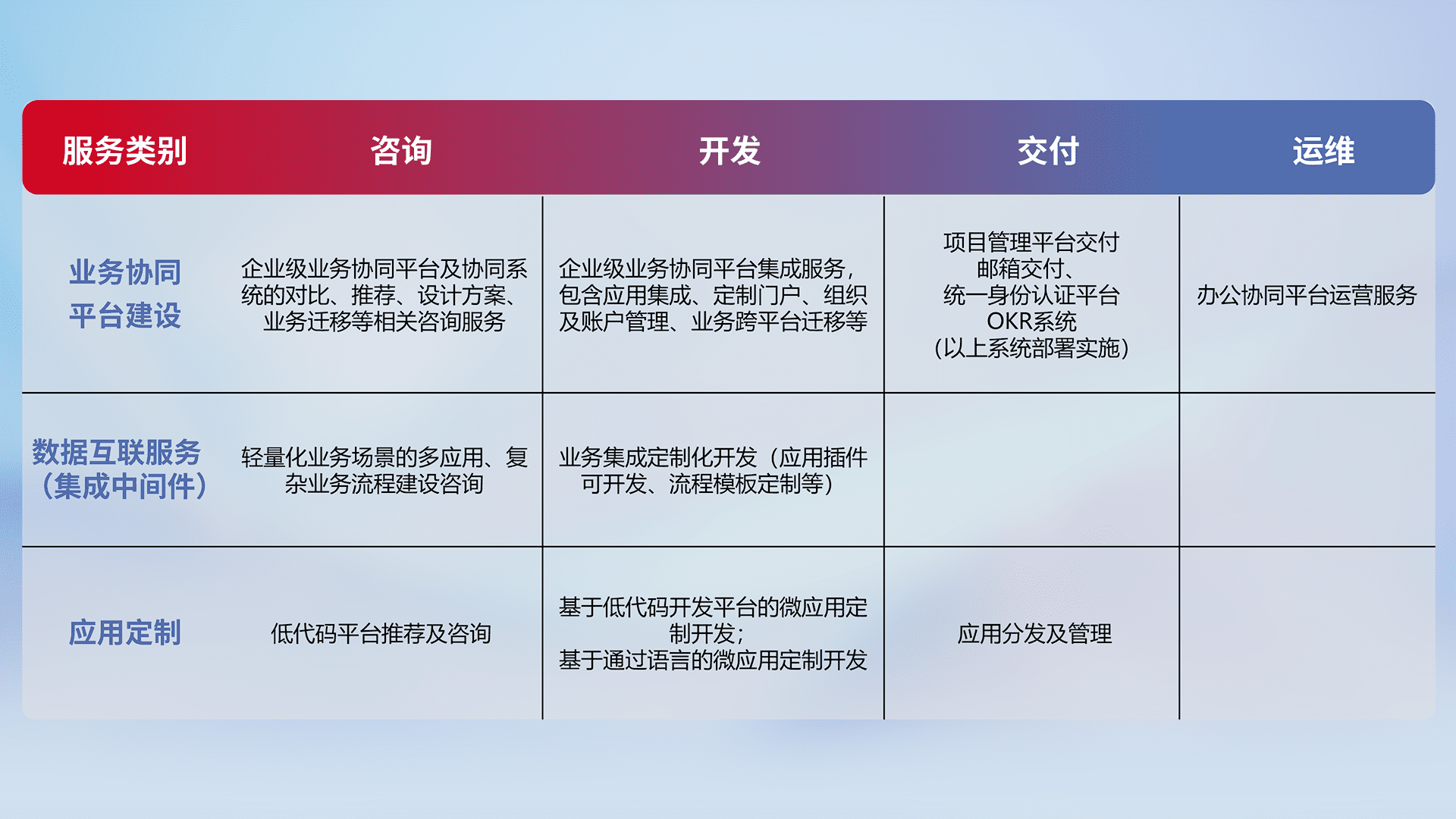 针对钉钉、、企微、、IDaas等平台级产品提供产品的规划、、、方案、、、、交付、、定制化开发等服务,,,实现如统一协同办公、、智能客户服务、、、、混合会议管理、、智能数据查询、、、、等业务场景,,实现数字化转型。。。