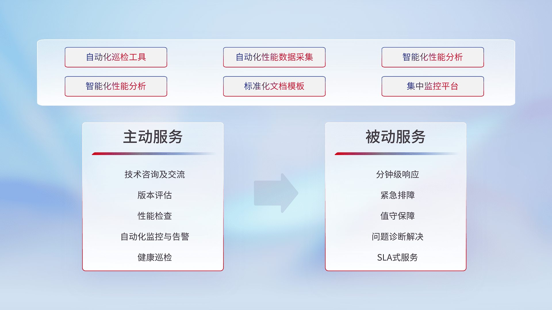 智能化工具和标准化文档,,,保障服务质量,,,,提供主动服务(包含技术咨询、、版本评估、、、、性能检查、、自动化监控与告警、、、、健康巡检)和被动服务包含(分钟级响应、、、紧急排障、、值守保障、、、问题诊断解决、、、SLA服务)。。。