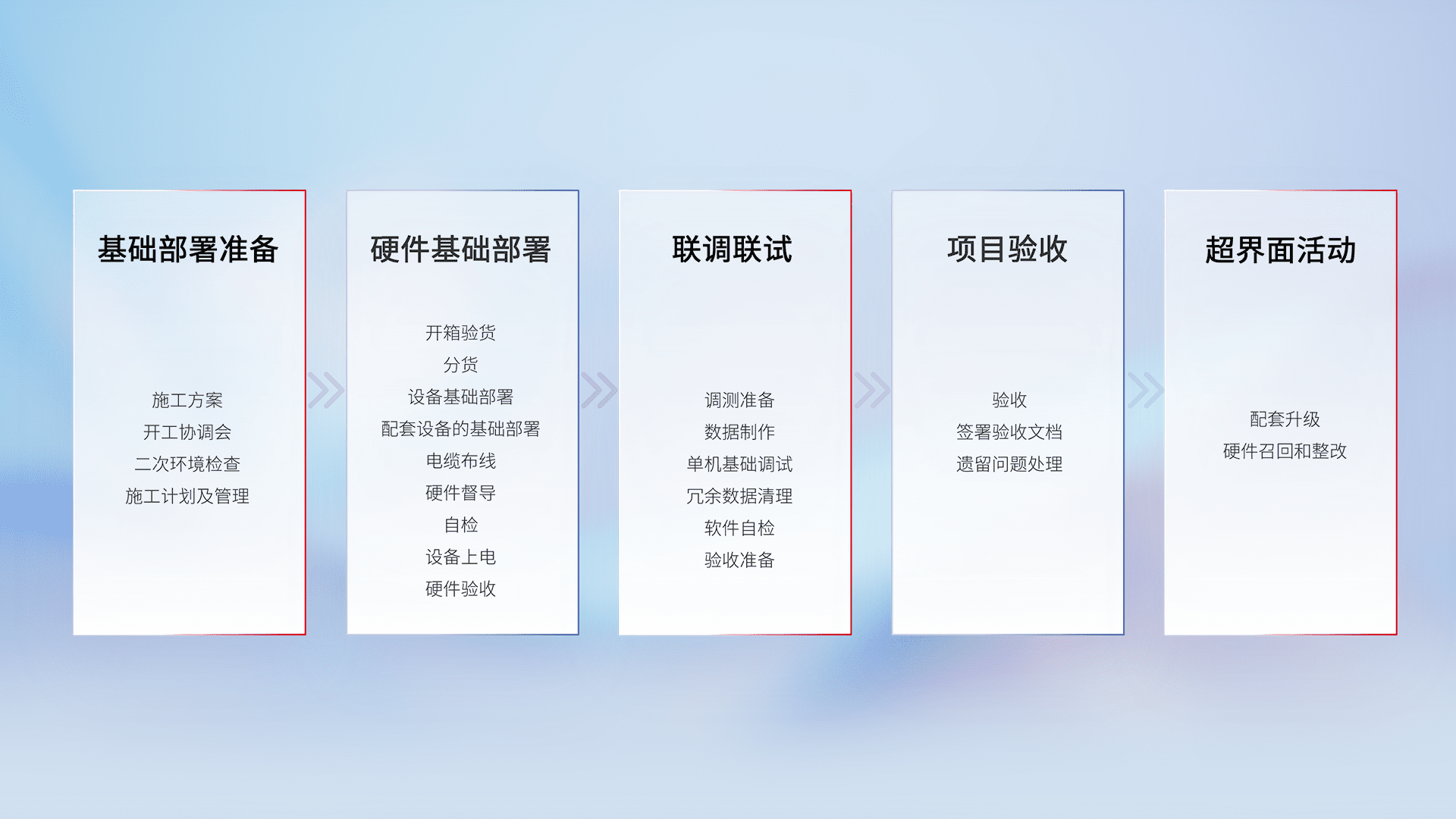 从基础部署准备、、、、硬件基础部署、、联调联试、、、项目验收、、、越界面活动的全过程可追溯,,,保证施工质量和进度。。。。